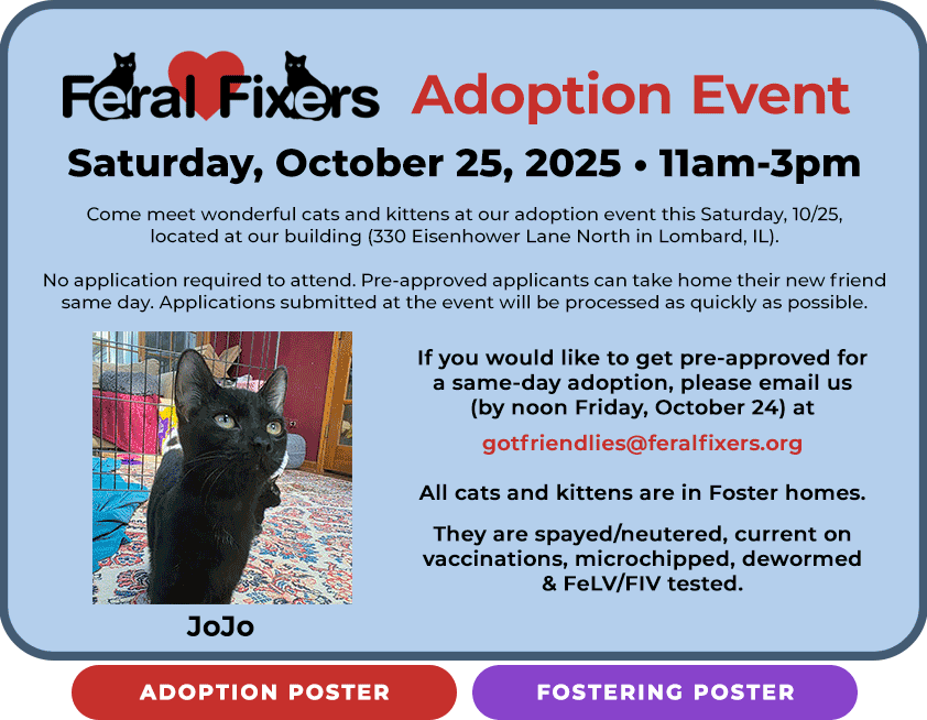 Saturday, 10/18 11-3pm at PetSmart, Finley Square Shopping Center, 1550 Butterfield Rd, Downers Grove, IL. The atmosphere is always upbeat during the PetSmart adoption events. Many of our fosters try to attend the adoption events so that you can get a full picture of the cats/kittens. Check out our Adoptables link on our Home page. Fill out an adoption application in advance, meetings can be scheduled at our building for those not in attendance!