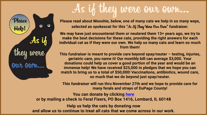 In October, Mooshie came to us from Woodridge. He had been around for awhile and clearly had Upper Respiratory. Because of being ill, he could not be neutered until he was healthier so he was started on antibiotics. His eyes were constantly gunked up, he was not eating and his gums were inflamed. In ten days of treatment – eye meds, oral antibiotics – his breathing was better, his eyes improved and even his gums were better! Persian mixes often have flat faces with short noses, making them susceptible to respiratory, dental and even eye issues. Mooshie clearly had entropion in both eyes – the eyelids fold inward into the eye, causing irritation and pain. On 11/3 he received his neuter, vaccinations, Convenia and entropion surgery in both eyes. Until we can be sure he will not rub his eyes, he has to wear an Elizabethan cone, frustrating him to say the least. Overall, he feels so much better! Eating very well, making happy paws and he can actually see now! Giving cats healthy and happy lives makes all the difference in what we do. Our thanks to our donors, our vets and our fabulous volunteers who care for all of the cats we encounter!