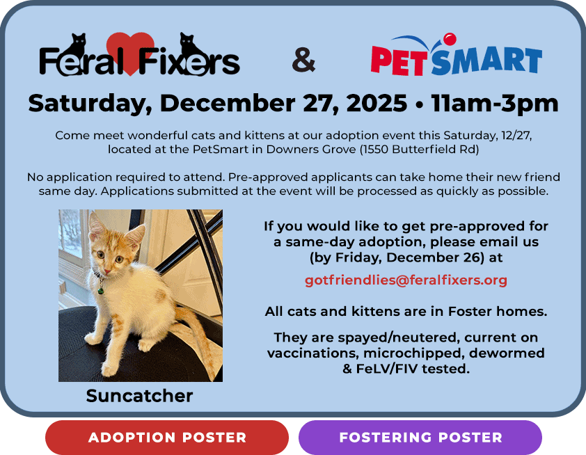 Sunday, January 18th 12 – 4pm at VFW Post 2801,39 E St. Charles Rd, Villa Park. Please register in advance by 1/10/26 for $15 or $20 at the door. Lots of food, boutique, cat people, fundraisers! If you would like to donate to our Silent Auction or raffles, please contact us