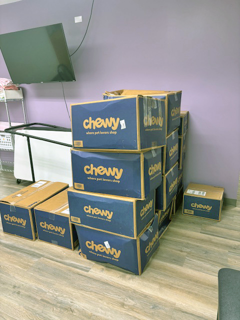 This is one of many recent Chewy shipments - kitten and adult canned food - thank you to everyone who have responded recently to our pleas for donations! FedEx guy hopes for kitten season to be over soon!