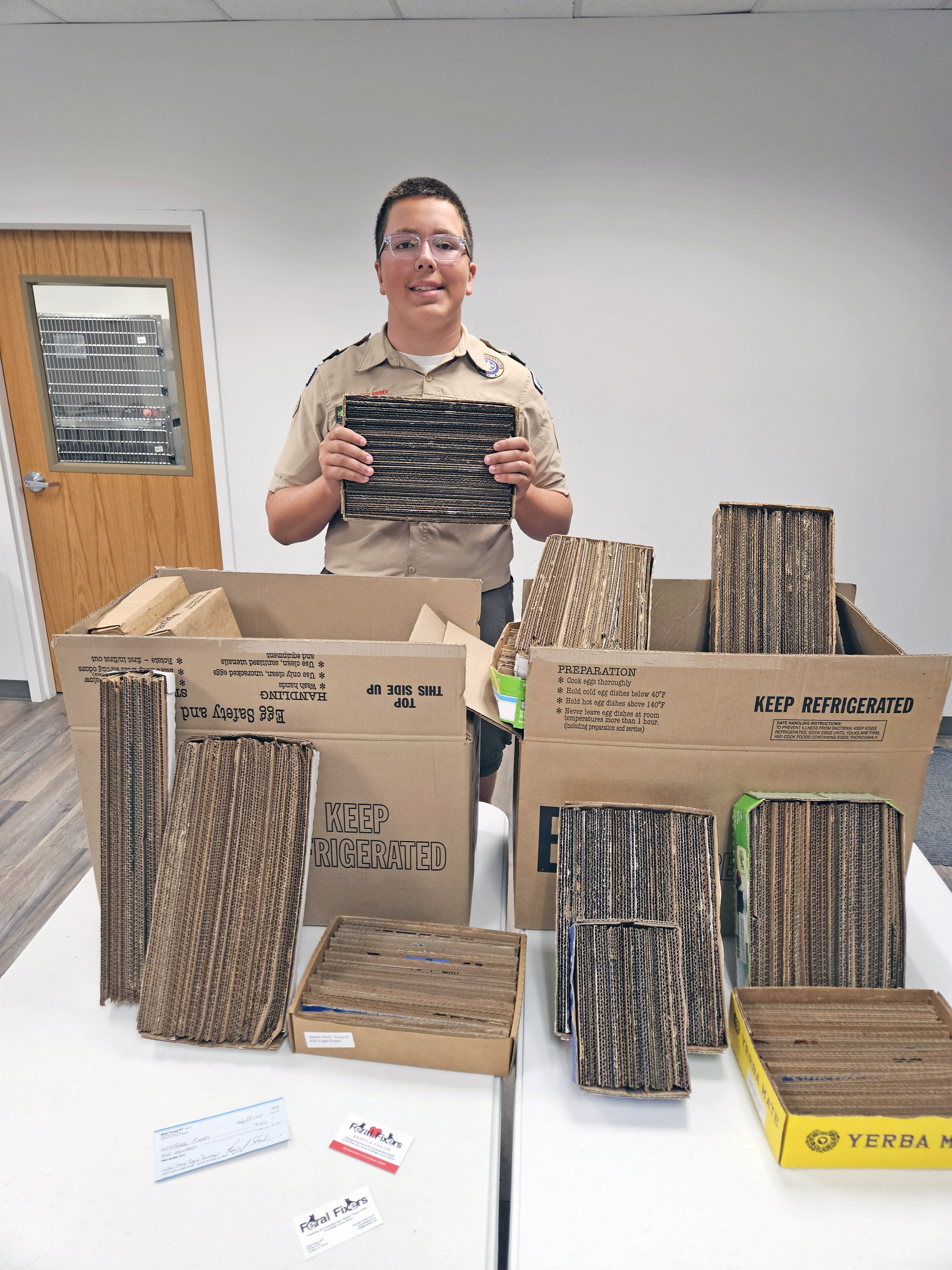 Joseph Stock presented an Eagle Scout project to create cardboard scratchers for Feral Fixers. He organized the effort and the Scouts to make two large boxes full! Very useful in different sizes. Leftover project funds were also donated! Some of the scratchers were put into immediate use in cages of kittens.