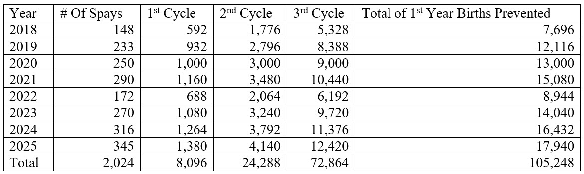 This chart shows the prevention of births based on ½ of all births being female and average of 4 kittens in each litter, 3 litters per year possible, cumulative effect.