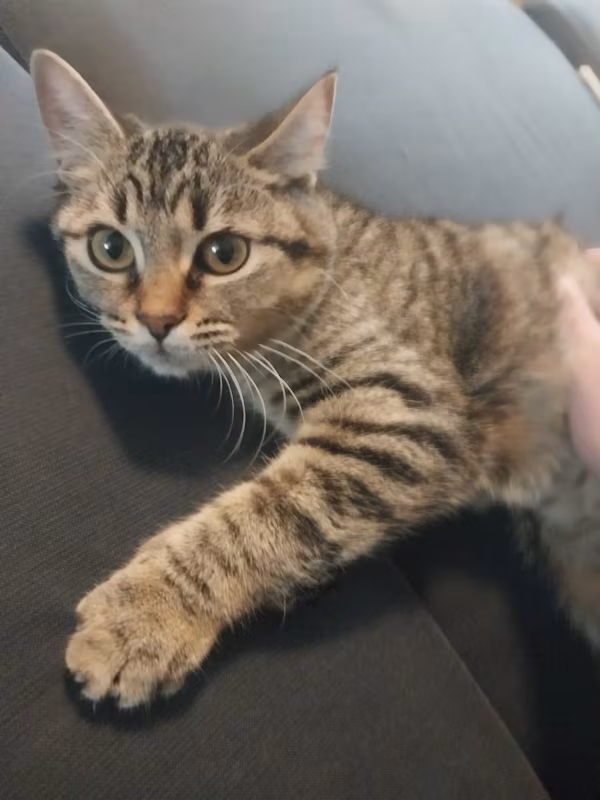 Korrie came to Feral Fixers in July of 2024. She is social, friendly and confident 2-year-old brown tabby that enjoys meeting new people and will be happy to greet your guests. Once she forms a bond with her person, she is quite the cuddler. She enjoys snuggling up and sleeping with her foster mom. She loves being petted, including chin and cheek rubs, forehead scratches and long strokes down her back. She purrs, makes biscuits, and follows your hand with her head to get more. With prominent black stripes and green eyes, Korrie's distinguishing feature is her unique tail. It folds back on itself in a "U" shape right near the end, so it looks like she is beckoning to you! Not demanding, she would be fine with someone who is away at work during the day. At times, she likes hanging out with her people and being part of the action. At other times, she is happy to entertain herself by chasing around a toy mouse or curling up in the sun for a nice nap. When you get home from work, she will be happy to greet you for some playtime and cuddling.