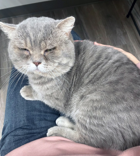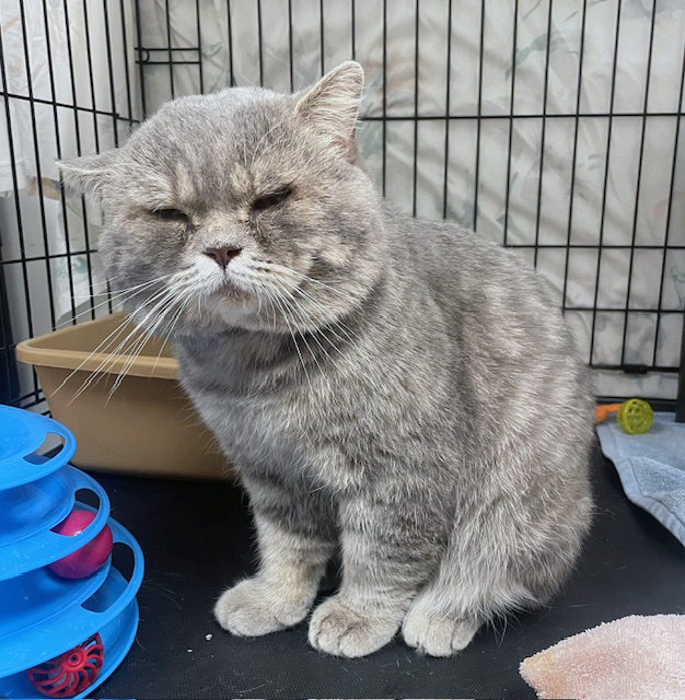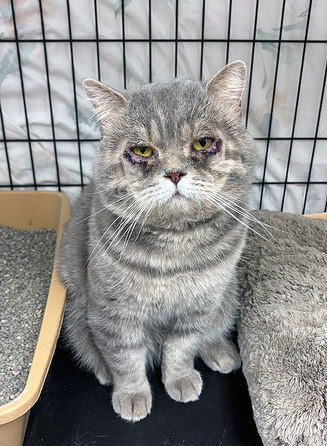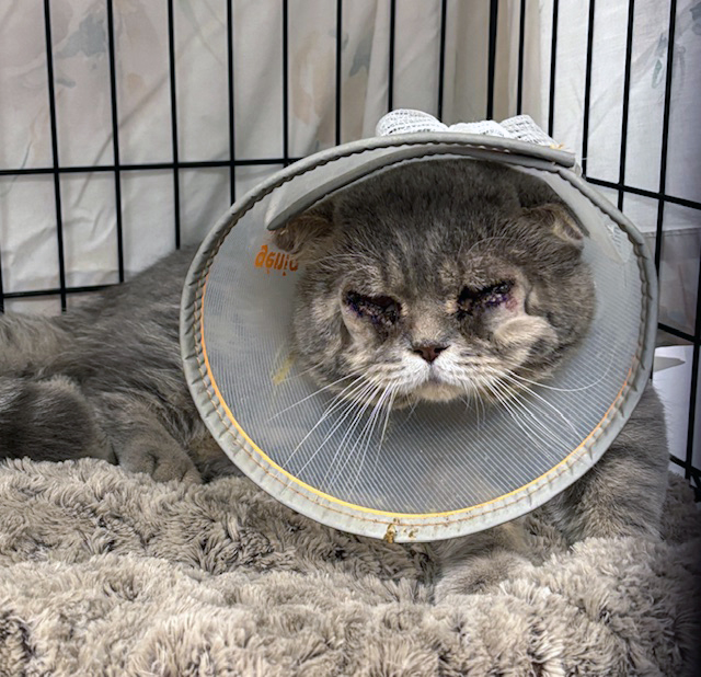 In October, Mooshie came to us from Woodridge. He had been around for awhile and clearly had Upper Respiratory. Because of being ill, he could not be neutered until he was healthier so he was started on antibiotics. His eyes were constantly gunked up, he was not eating and his gums were inflamed. In ten days of treatment – eye meds, oral antibiotics – his breathing was better, his eyes improved and even his gums were better! Persian mixes often have flat faces with short noses, making them susceptible to respiratory, dental and even eye issues. Mooshie clearly had entropion in both eyes – the eyelids fold inward into the eye, causing irritation and pain. On 11/3 he received his neuter, vaccinations, Convenia and entropion surgery in both eyes. Until we can be sure he will not rub his eyes, he has to wear an Elizabethan cone, frustrating him to say the least. Overall, he feels so much better! Eating very well, making happy paws and he can actually see now! Giving cats healthy and happy lives makes all the difference in what we do. Our thanks to our donors, our vets and our fabulous volunteers who care for all of the cats we encounter!