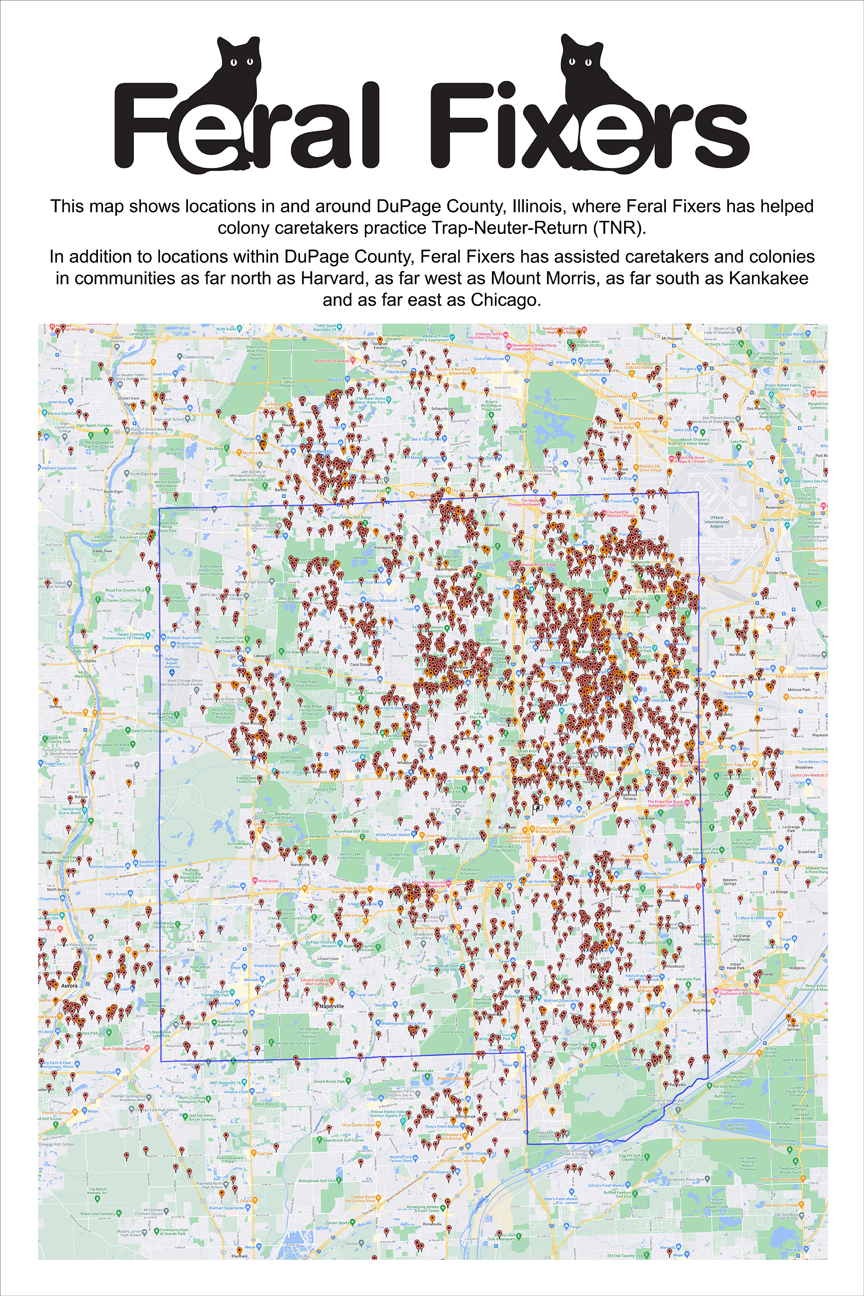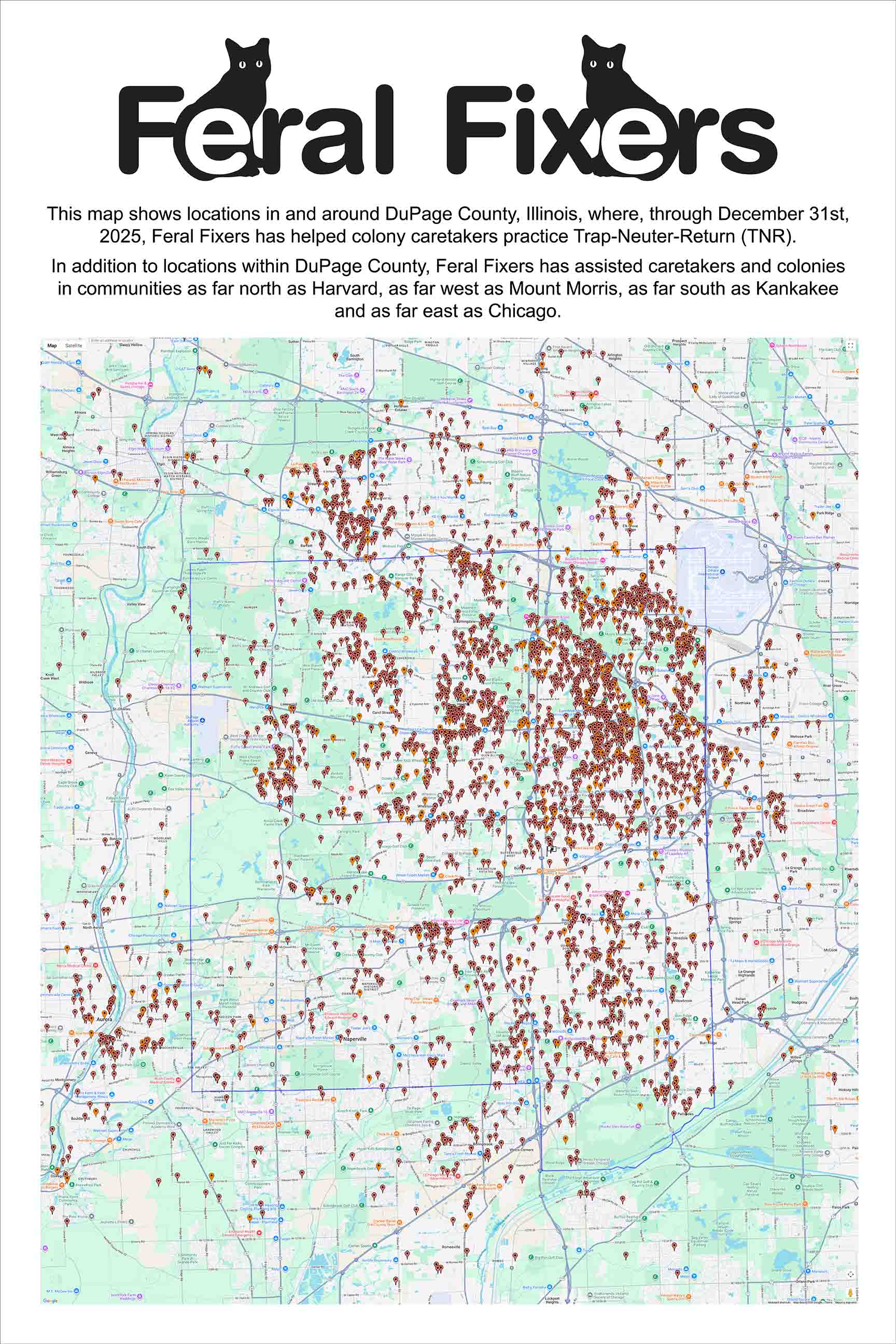 The indicator icons on the map point to all of the locations in and around DuPage County that Feral Fixers has helped since its inception. The blue border shows the exact boundaries of DuPage County.